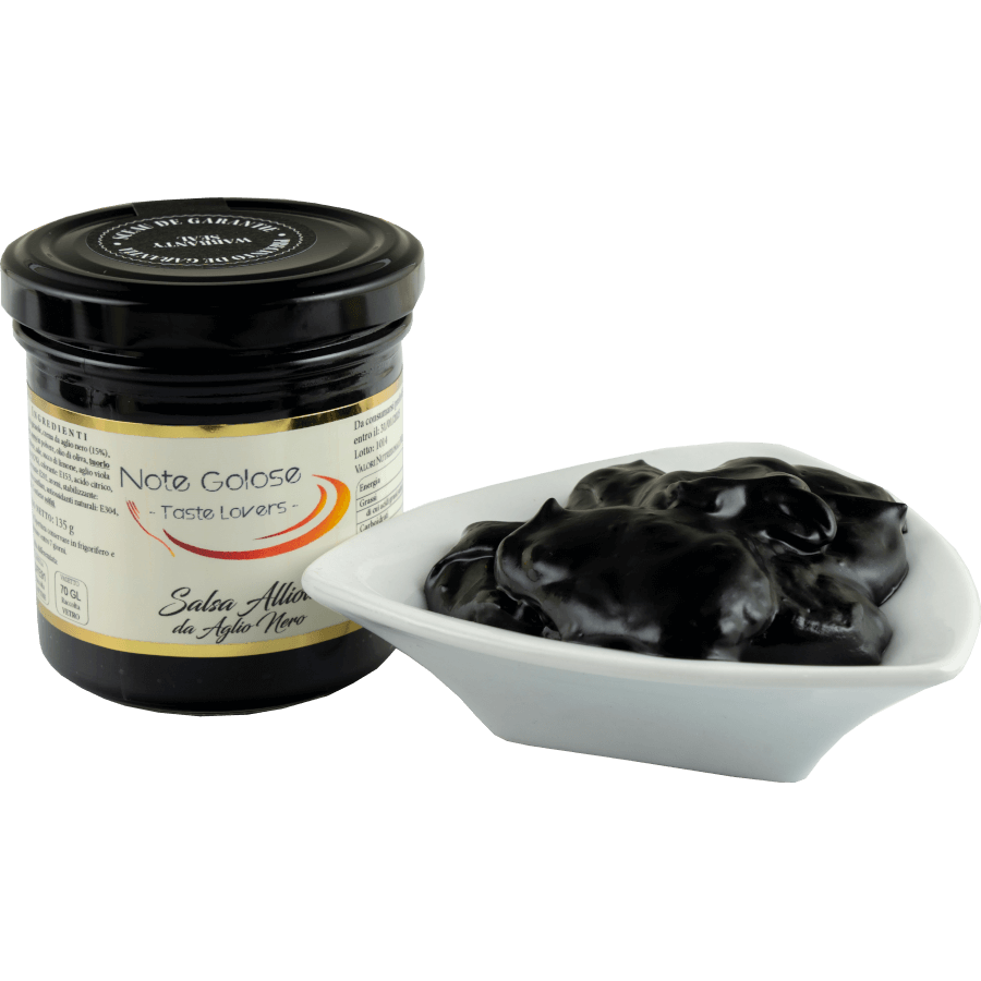 Una salsa allioli diversa ed unica, realizzata con aglio nero. Quest’aglio, conosciuto anche come black allium, si presenta in spicchi dal colore nero e le sue caratteristiche sono una consistenza morbida e cremosa, il sapore più dolce rispetto a quello del comune aglio bianco, senza note piccanti. Inoltre, non ha odore e non lascia neppure alito sgradevole, per questo può essere tranquillamente consumato crudo. L’aglio nero è ottenuto dalla fermentazione dei bulbi in un ambiente ad umidità elevata e temperatura controllate per un mese, senza alcuna aggiunta di additivi o conservanti. L’aglio nero è considerato un super food, perché vanta proprietà benefiche per l’organismo. Diversi studi condotti in Giappone, ad esempio, hanno evidenziato come, rispetto all’aglio bianco, abbia il doppio degli anti-ossidanti, sia un alimento naturalmente povero di grassi, ma ricco di sali minerali. Buono anche il contenuto di fibre e proteine.