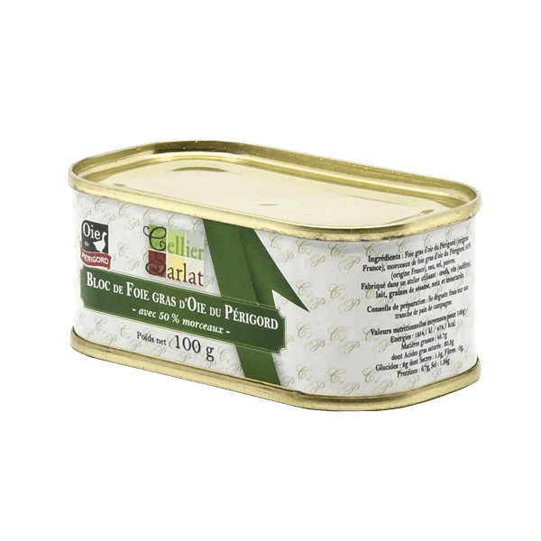Paté di fegato grasso d’oca con il 50% di pezzi di fegato grasso intero che appaiono al taglio, si presenta in forma di piccolo parallelepipedo da 100 g.