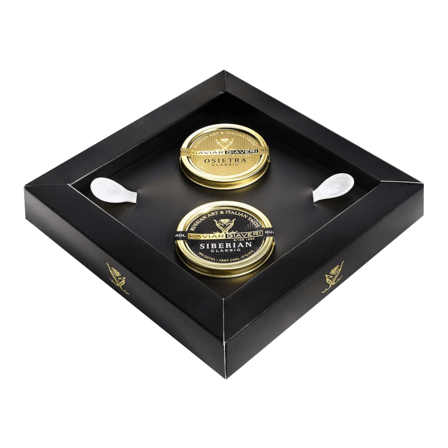 Il miglior modo per conoscere i sapori racchiusi nel caviale firmato Caviar Giaveri, in tutte le sue varietà: per voi e i vostri ospiti abbiamo creato l’esclusivo Luxury box The King and the Queen, degustazione di 2 caviar cru. Perfetto per accompagnare un elegante appuntamento o un party raffinato, rappresenta un piacevole percorso gustativo alla scoperta delle differenti qualità percettive che ogni varietà di caviale esprime.