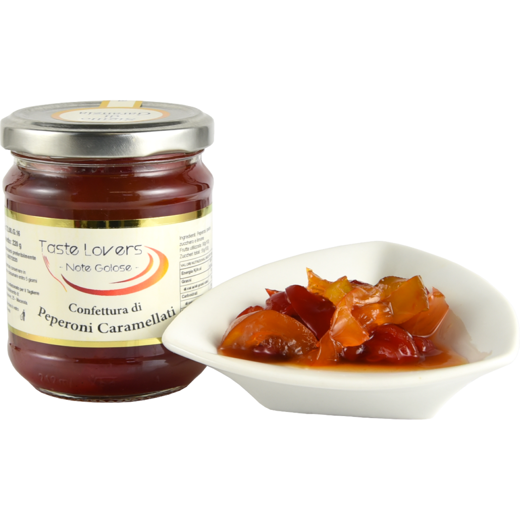 Confettura di peperoni tagliati alla julienne e glassati. Il colore è particolarmente invitante e rivela tutte le tonalità più brillanti del giallo, dell’arancio, del rosso e del verde, tipiche dei peperoni. Il profumo è intenso, mentre il sapore, delicatamente dolce, si presta ad accompagnare carni bianche o formaggi affumicati come la scamorza. Ottima anche in accompagnamento a molti piatti di carni rosse.