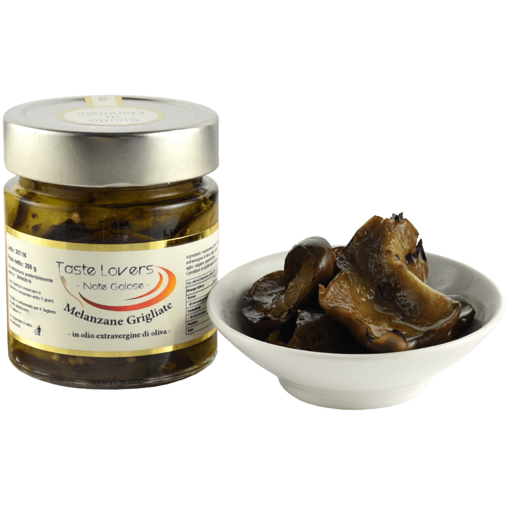 Melanzane grigliate, tagliate a fette e conservate in olio di oliva con aglio a fette, origano e peperoncino che conferiscono un gusto fresco e delizioso. Ottime come contorno per carni e formaggi, come antipasto o spuntino.