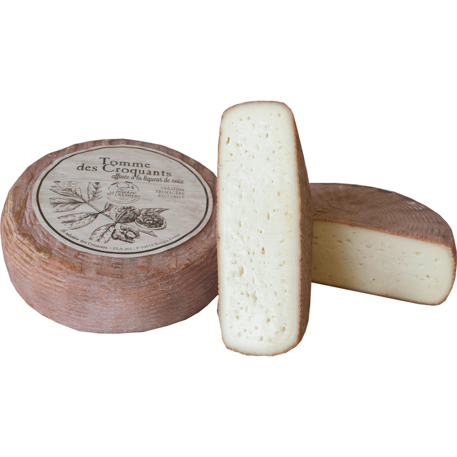 La Tomme des Croquants è un formaggio francese di latte vaccino intero e pastorizzato dal peso di circa 700g, a pasta pressata su uno stampo che ricorda un cesto di vimini e che gli conferisce una curiosa crosta con striature regolari e concentriche. Viene lavato tre volte durante le sei settimane di maturazione in una soluzione salina con l’aggiunta di liquore di noci caramellate che gli conferisce il suo colore marrone chiaro e il sottile aroma di nocciola. La pasta color avorio è morbida e liscia, con qualche piccola occhiatura, e un delicato sapore di nocciola, mentre la crosta marrone scuro fornisce note più decise.